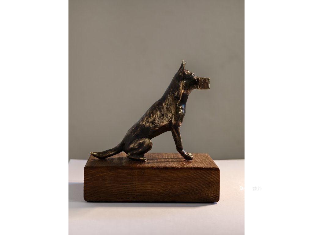 Soška holandského ovčáka držící aport vyrobená z mosazi s dřevěným podstavcem a libovolným jménem psa.